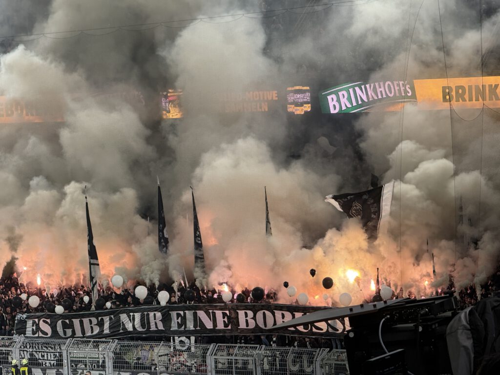 Heute ein sogenanntes Hochrisikospiel. Die sogenannten Störerszenen die es ja bei jedem Verein gibt, haben sich angeblich verabredet und nutzen den für sie spielfreien Tag um auf dieser Bühne Aufmerksamkeit zu erlangen und sich mit anderen zu messen. Darunter auf Gladbacher Seite Teile der Schalker Szene, Union Berlin, KRC Genk aus Belgien und ASU Politehnica Timisoara aus Rumänien. Auf der Gegenseite solidarisieren sich mit der BVB Szene, gewaltbereite Anhänger des 1.FC Köln, Rot-Weiß Essen und Bröndby Kopenhagen. Von Pyrotechnik natürlich gar nicht zu reden. Nach der Innenministerkonferenz oft das gleiche Bild auf den Tribünen. Grelles Licht mit beißendem Rauch gemischt. Mal schauen was es heute so gibt.