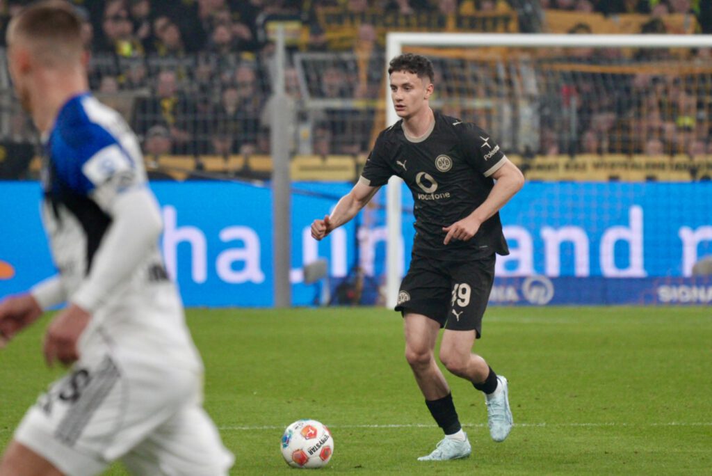 In den Sondertrikots zu 100 Jahre Stadion Rote Erde geht’s los. Beier gleich mit der ersten Chance, aber Heuer Fernandes behält die Übersicht und wehrt den Ball aus kurzer Distanz ab. Der BVB verpasst es, den Druck auf das HSV-Tor aufrechtzuerhalten, und ein Angriff in der 18. Minute reicht dem HSV aus, um Kobel zu überwinden. 1:0 für den HSV. Svensson hatte zuvor den Ball auf der linken Seite verloren. Trainer Polzin hat seine Mannen gut eingestellt.